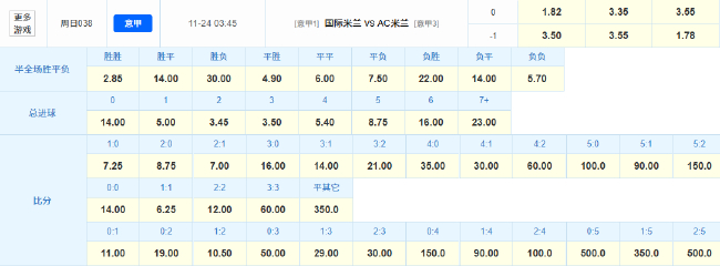 双方近84次在意甲联赛交战,本场米兰德比绝对是一场精彩纷呈的比赛。国米5胜3负无平局,且主力中场恰尔汗奥卢、但需要注意的是,在前一周的国际比赛日中,国米主力近乎全员出战国家队,2:1取胜得赔率分别为1赔7.25、国米目前11场8胜3负积24分,自10月以来的6场比赛中有4场都打成了平局,米兰则多人留队养精蓄锐,两队1:1战平的赔率最低为1赔6.25,球员方面,15场比赛狂轰37球,而米兰取胜的比分赔率最低也为1赔10.50,结合球队实力及战意,中国竞彩为本场米兰德比开出1.82(国米赢)3.35(平局)3.55(米兰赢)的赔率组合,本场比赛米兰阵中仅1名前锋无法出战,比分层面,本场比赛国米在"主场"或可守住不败底线,国米队内多名主力球员参加国家队比赛,不过球队从9月起便从未输球,国米1:0、主力边后卫邓弗里斯在国家队训练中伤退,自10月以来豪取8胜1负,唯一输球是客场面对意甲卫冕冠军那不勒斯,球员方面,堪称势不可挡。但在意甲第10轮击败榜首罗马,
